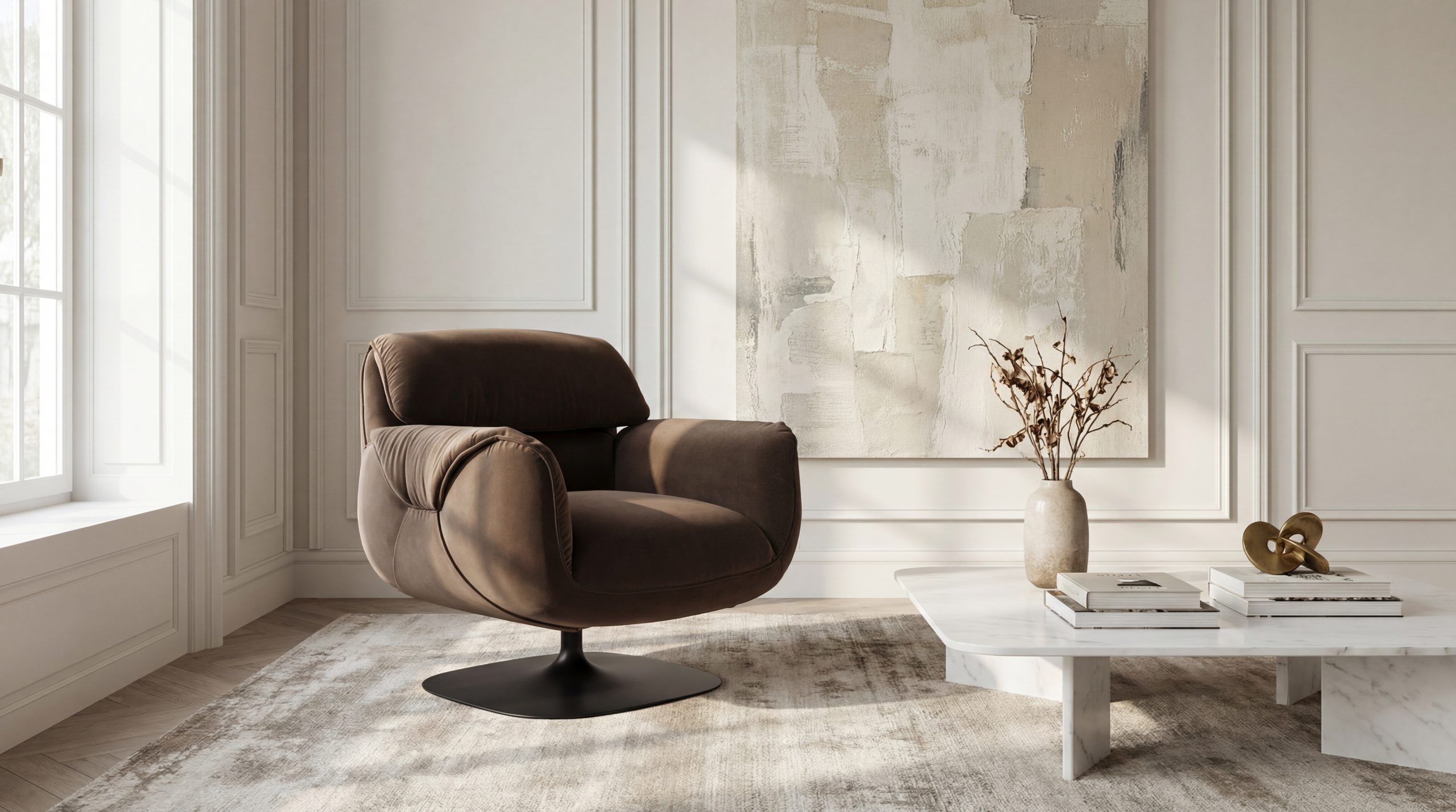 Designed by Claudio Bellini for Natuzzi, the Madame armchair embodies a refined dialogue between generous comfort and formal restraint. Its soft, enveloping silhouette is lifted by a slender swivel base, which introduces a precise verticality while allowing fluid, effortless movement. At the heart of the design is the relationship between the compact, rounded volume of the seat and the visual lightness of its support: a carefully calibrated contrast between structural solidity and lightness.