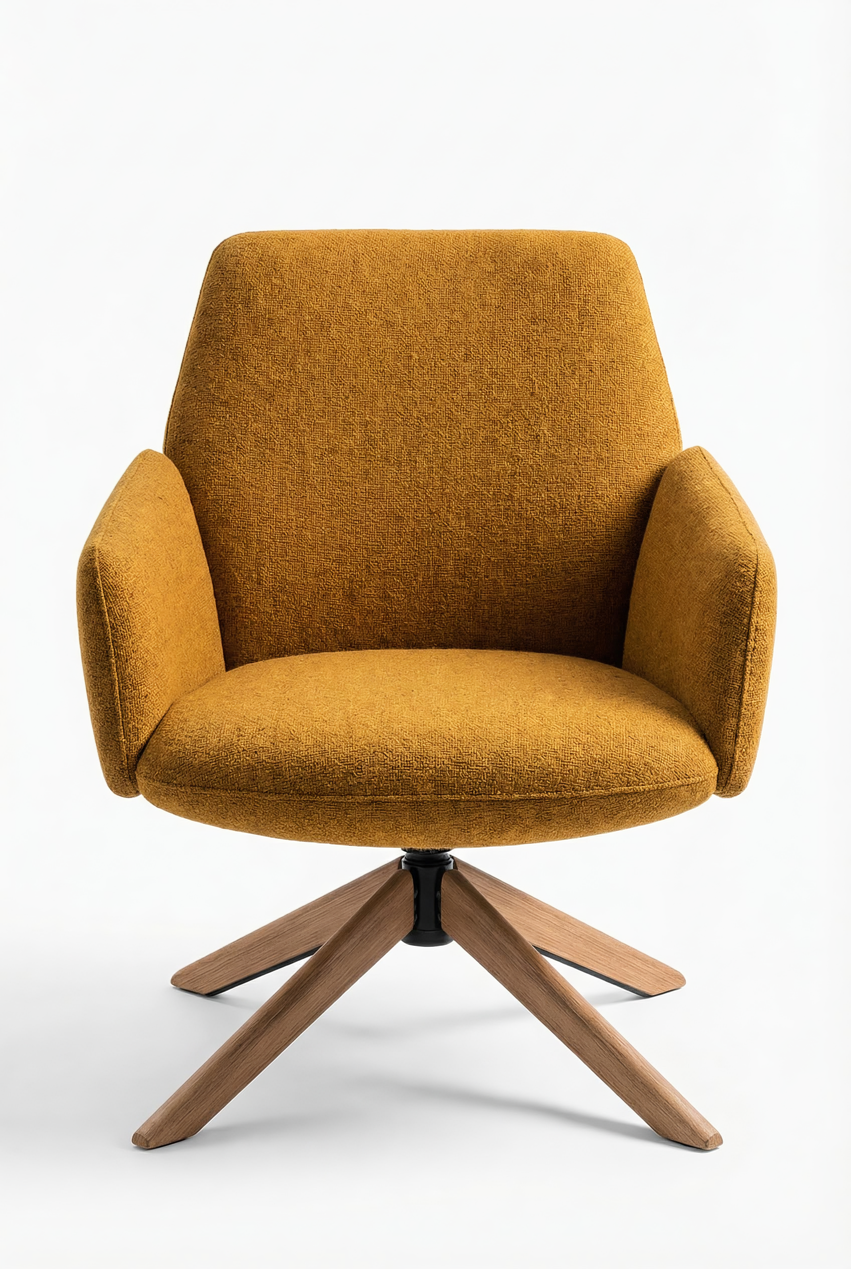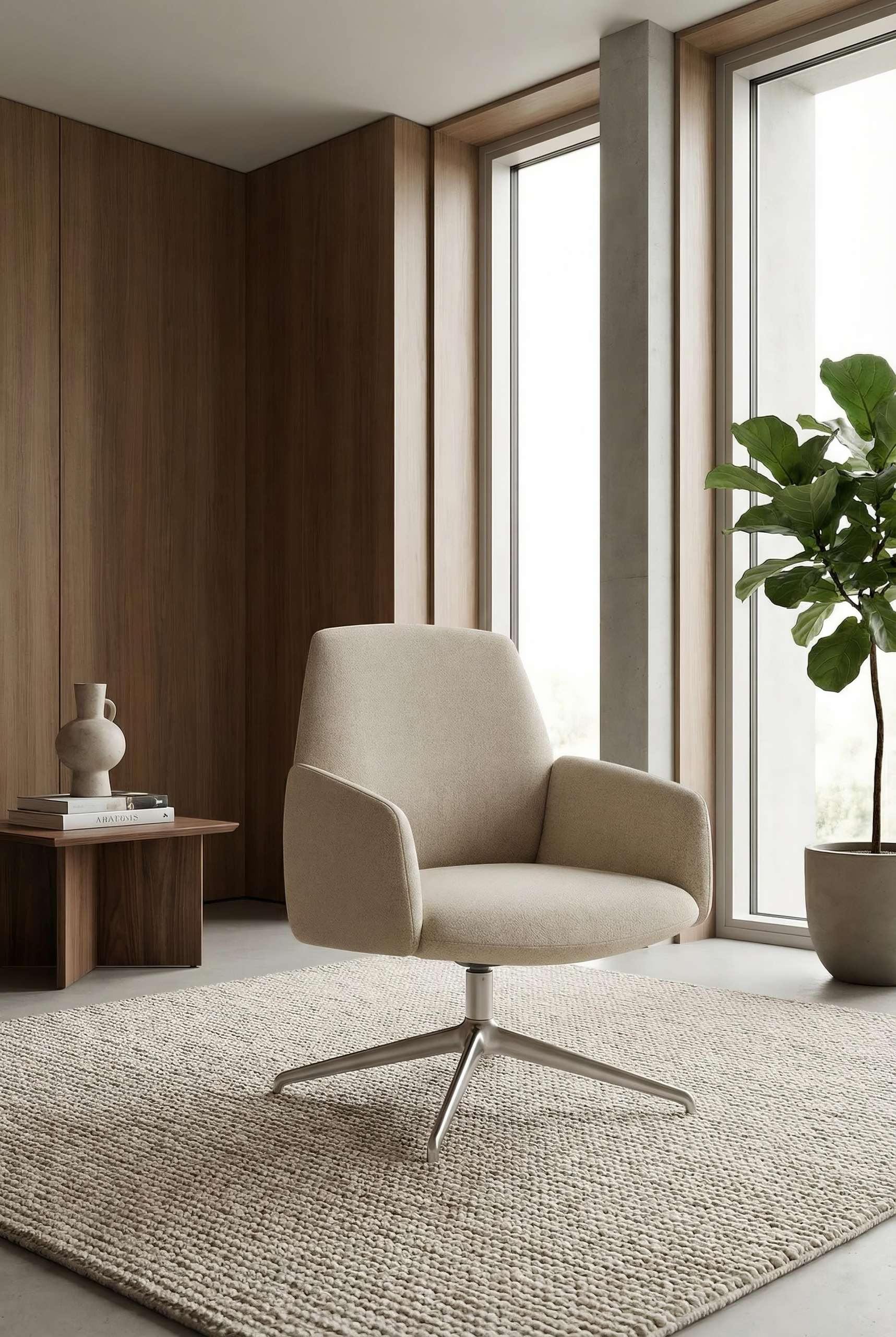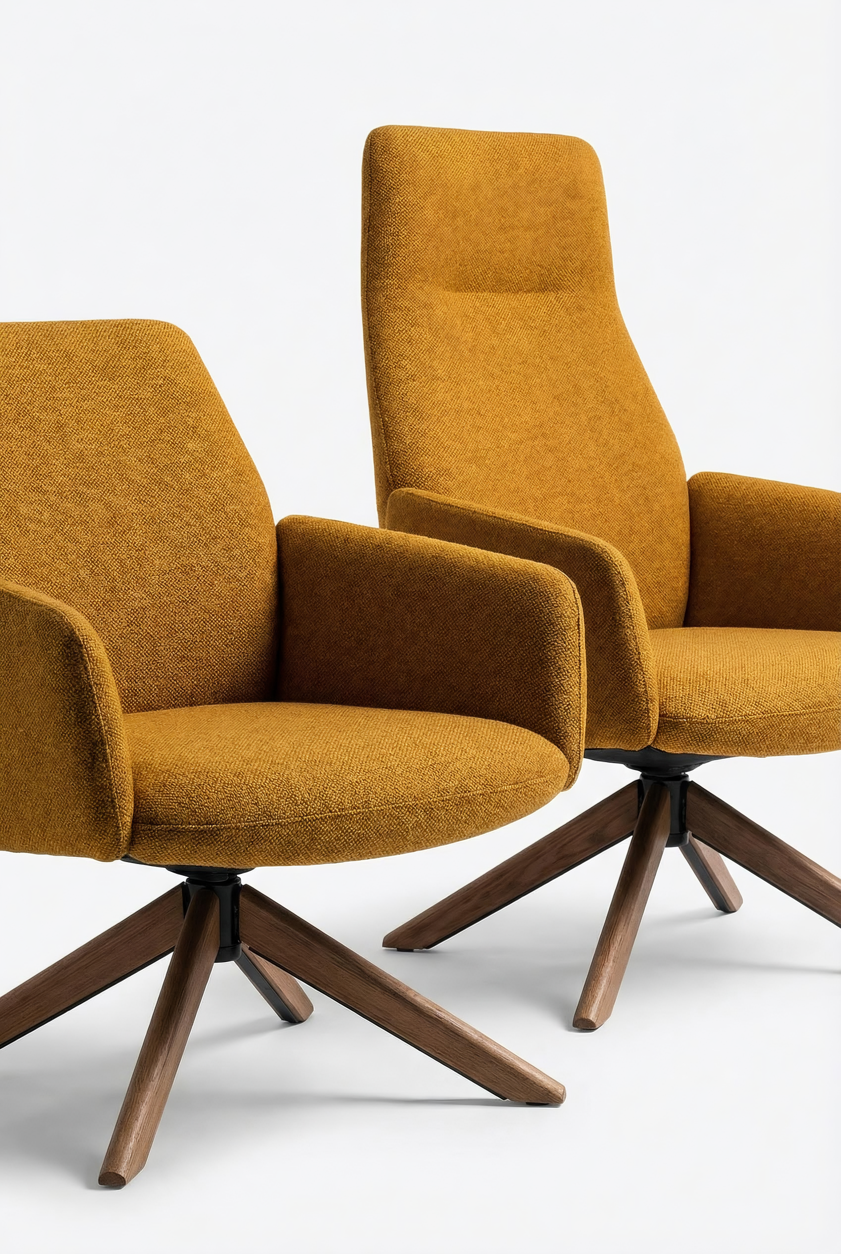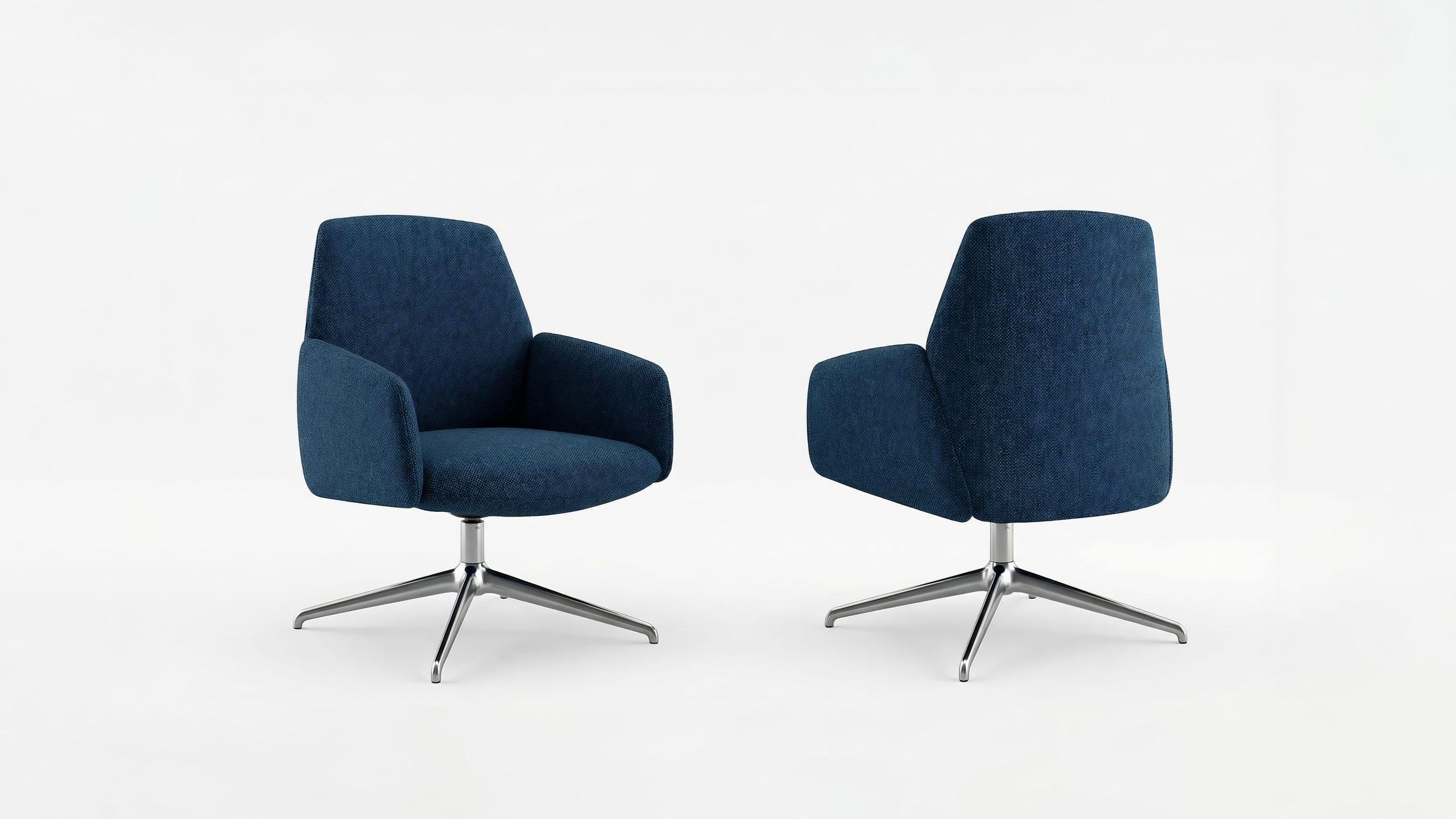 The armrests, whose sinuous form recalls flower petals, create a sense of protection while maintaining a clear, controlled silhouette. The backrest incorporates a flexing mechanism that follows the movement of the body when reclining, introducing a calibrated dynamic comfort without altering the formal clarity of the chair. This responsive behaviour becomes an integral part of the design, where ergonomics and structure are resolved in a single gesture. The availability of mid-back and high-back versions allows the same design language to address different levels of support and degrees of privacy, adapting to a variety of lounge and workplace environments. The four-star base, available in wood or metal, establishes a measured contrast with the generous upholstered body, adding visual lightness to the composition.