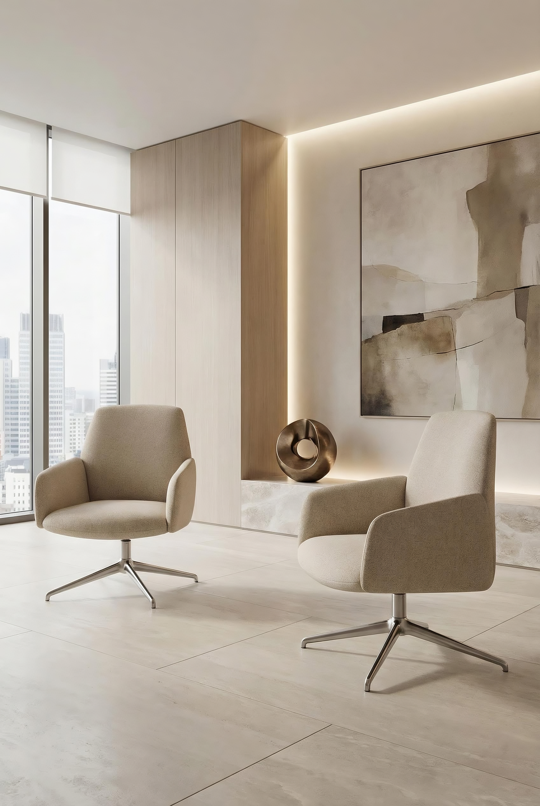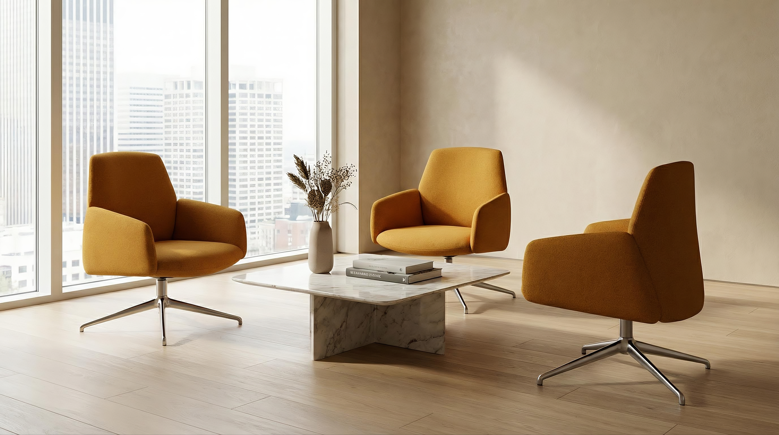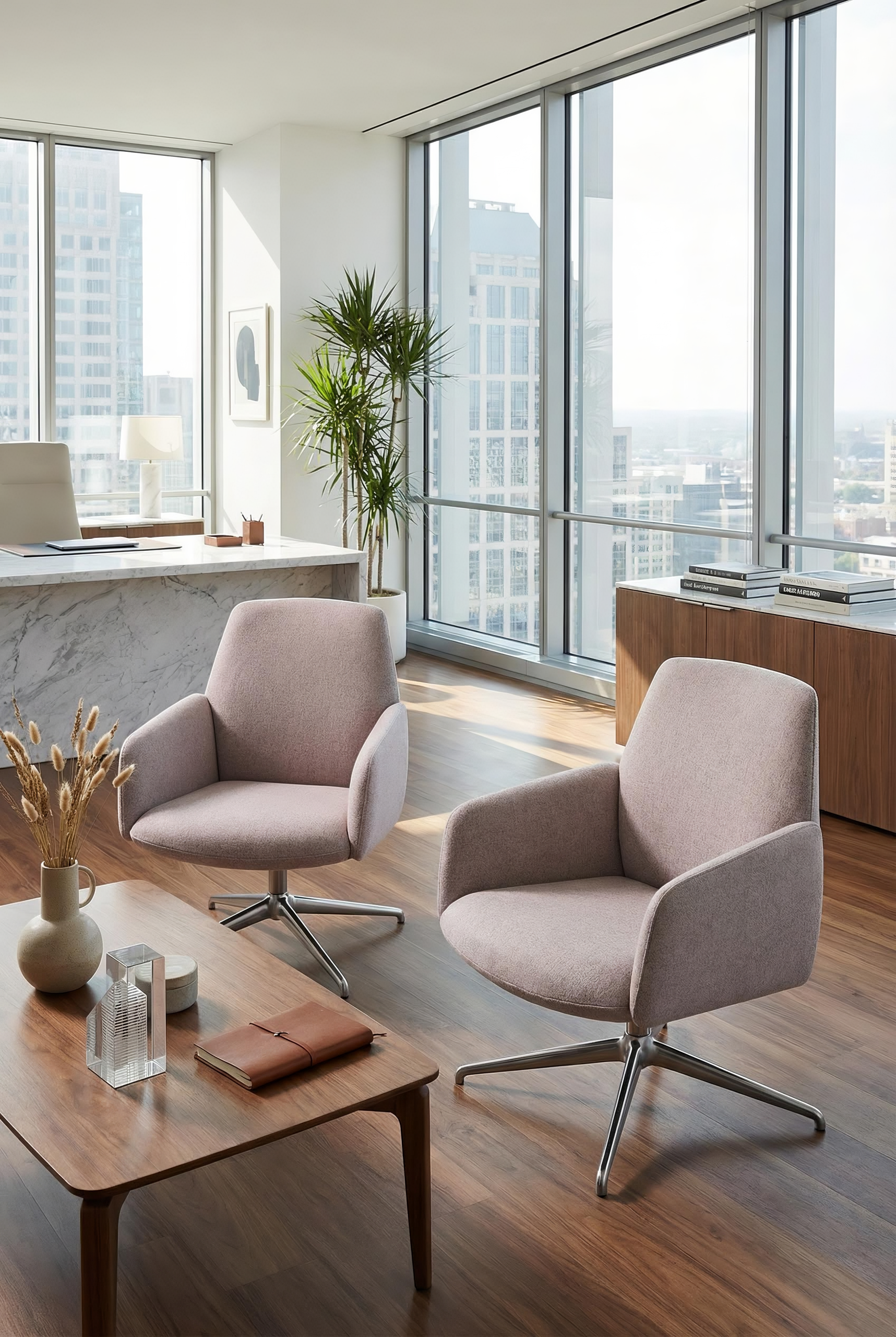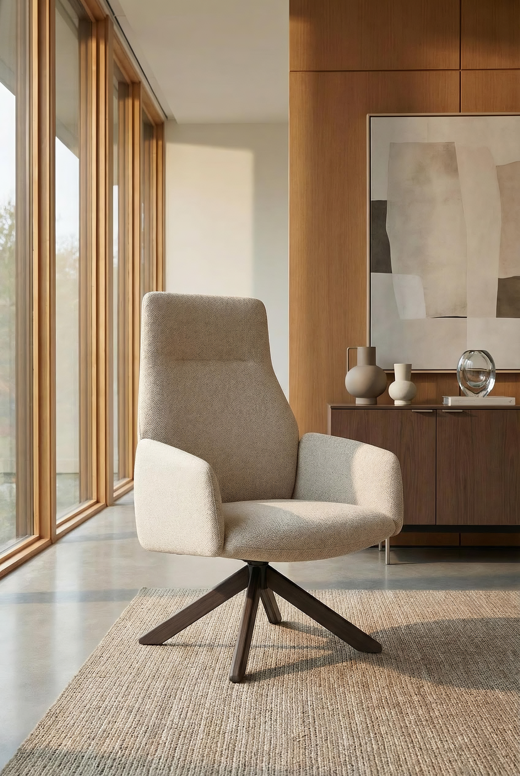 The armrests, whose sinuous form recalls flower petals, create a sense of protection while maintaining a clear, controlled silhouette. The backrest incorporates a flexing mechanism that follows the movement of the body when reclining, introducing a calibrated dynamic comfort without altering the formal clarity of the chair. This responsive behaviour becomes an integral part of the design, where ergonomics and structure are resolved in a single gesture. The availability of mid-back and high-back versions allows the same design language to address different levels of support and degrees of privacy, adapting to a variety of lounge and workplace environments. The four-star base, available in wood or metal, establishes a measured contrast with the generous upholstered body, adding visual lightness to the composition.
