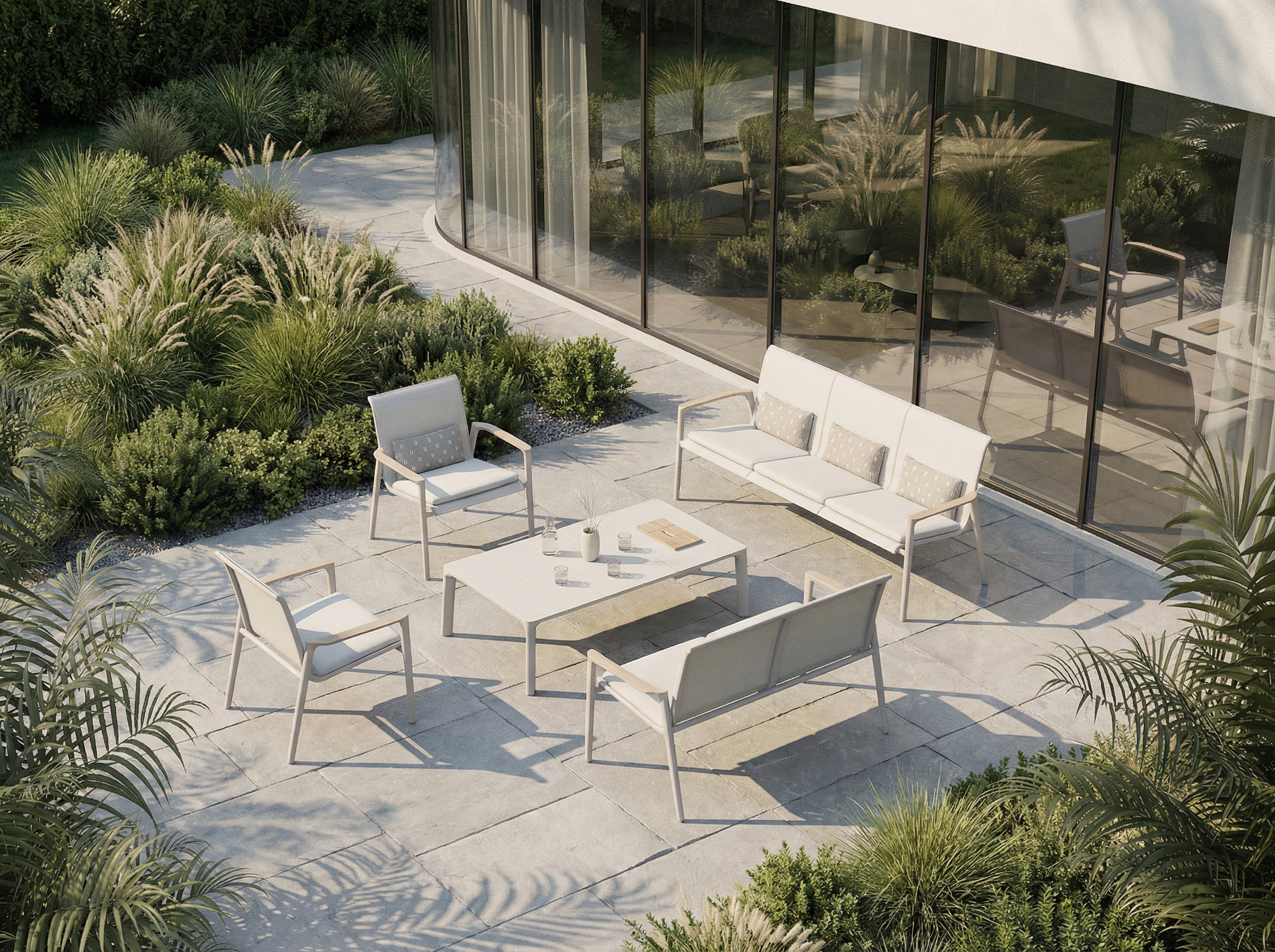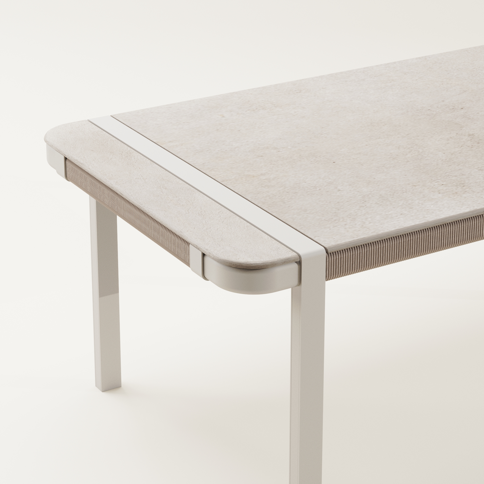 TIKI introduces a seating system defined by architectural clarity and refined material contrast. A minimalist aluminum framework provides structural rigor, supporting an elegant backrest crafted with intricate rope weaving. The result is a sophisticated balance of strength, texture, and comfort, designed to elevate contemporary outdoor spaces.