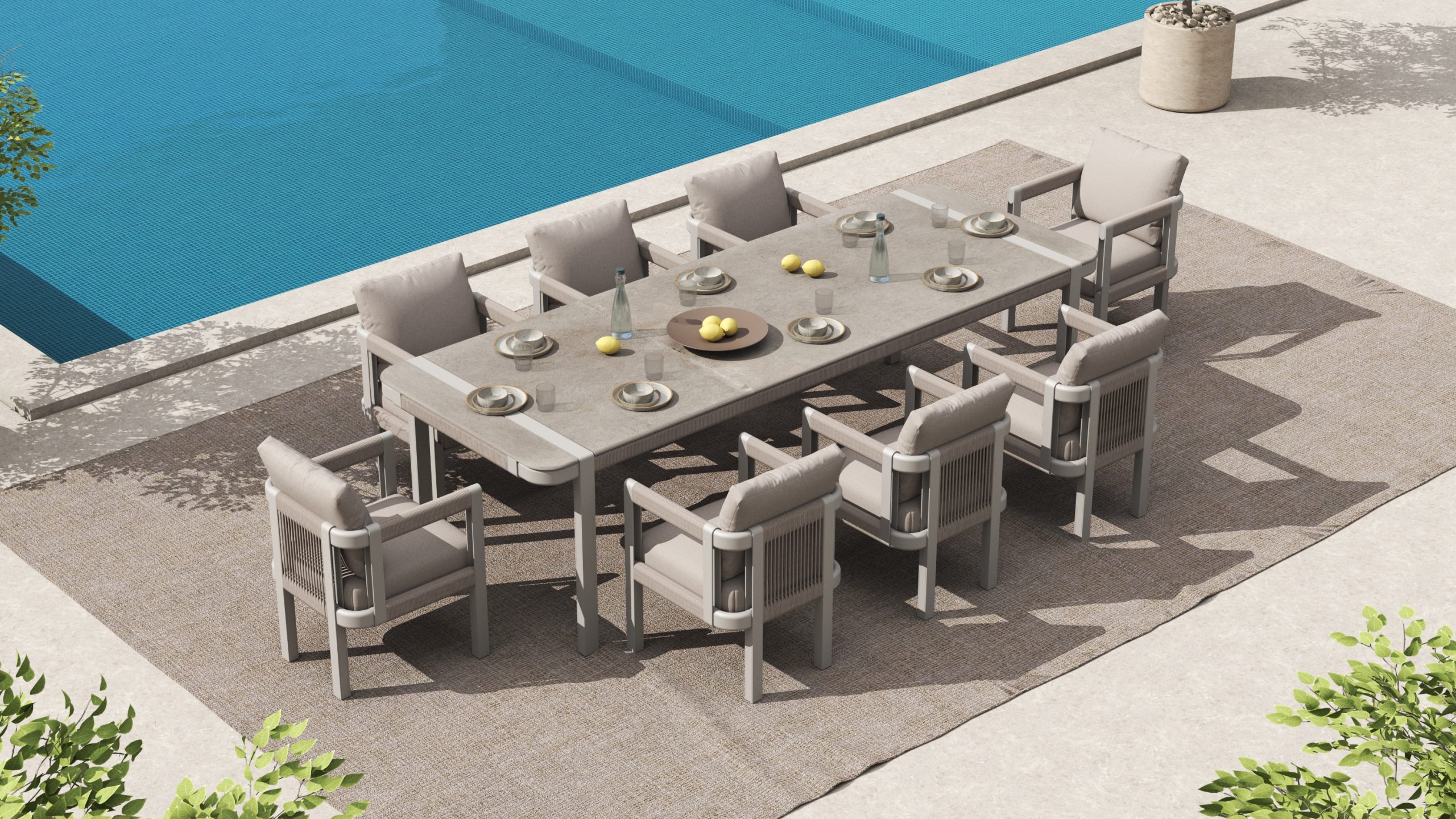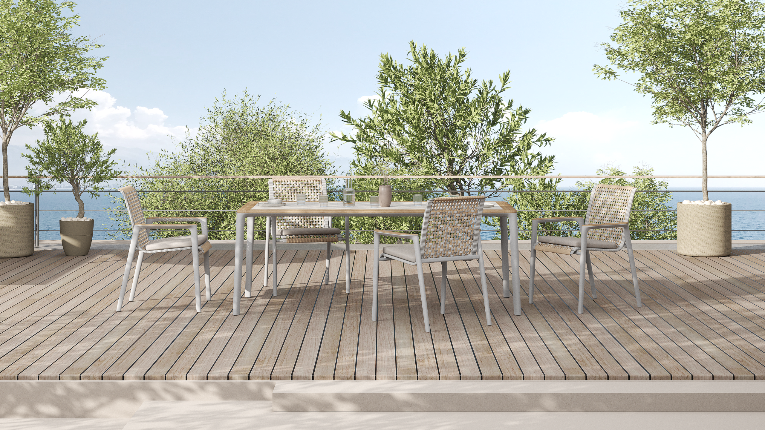 The PAROS Dining Set extends the architectural language of the Paros lounge series into a refined dining experience. The design features the collection’s signature vertical rope weaving combined with a bold aluminum frame, creating a distinctive rhythm of structure and texture. The result is a balanced composition that feels both solid and visually light, perfectly suited to contemporary outdoor environments.