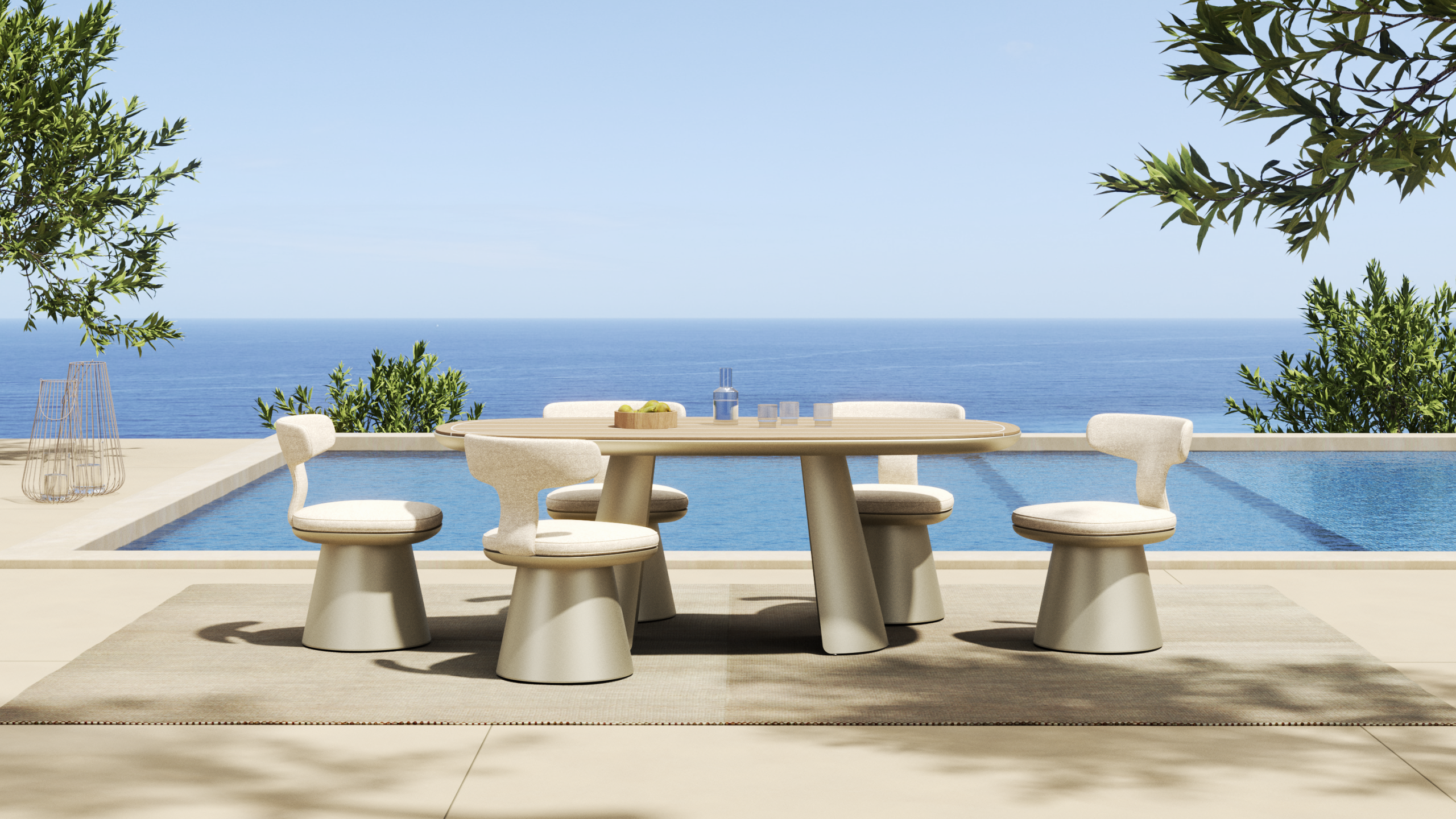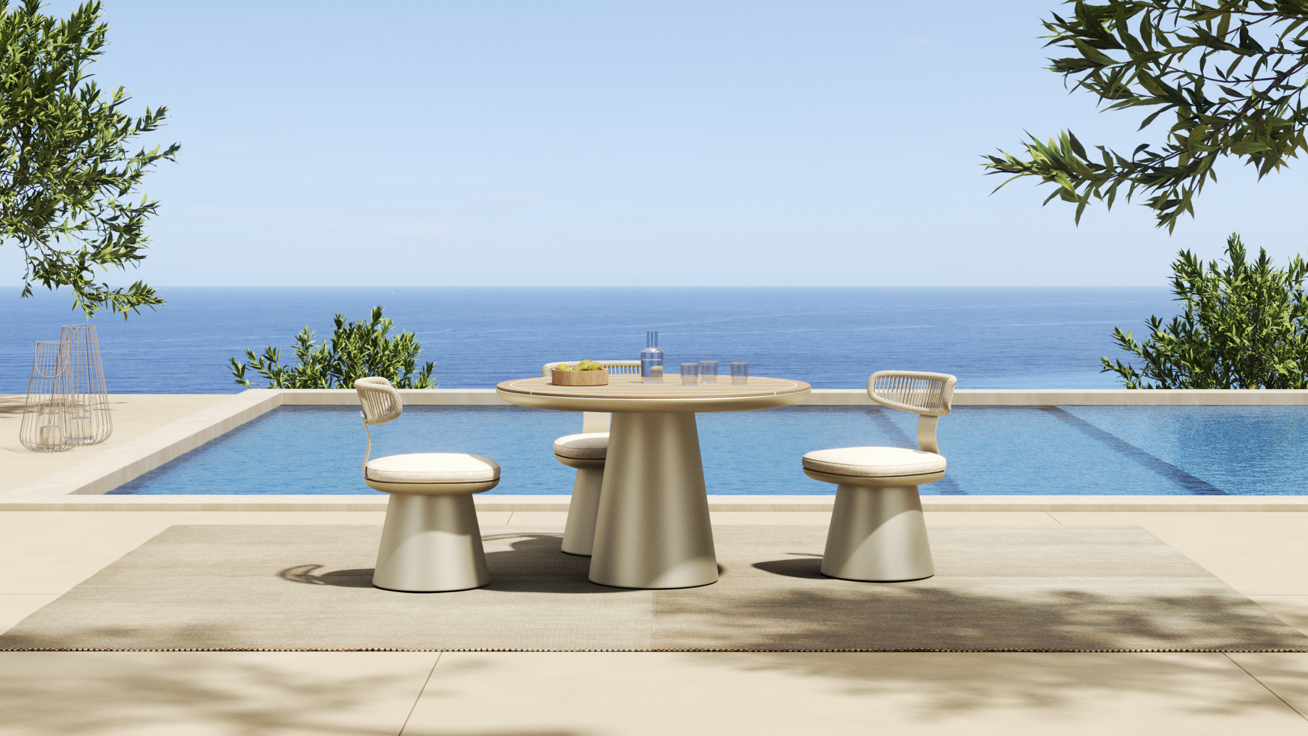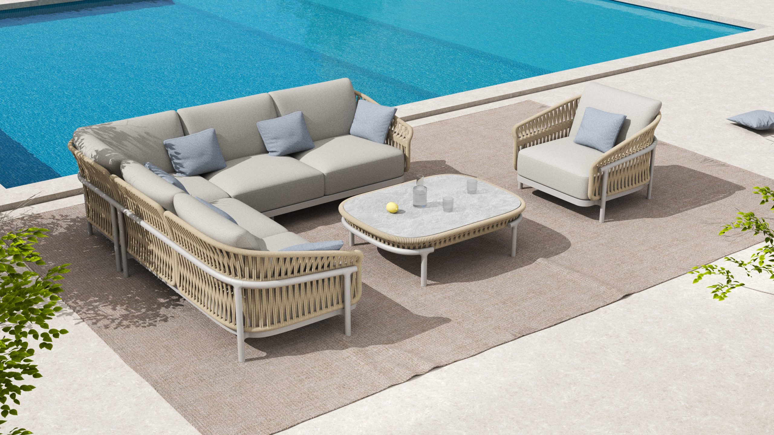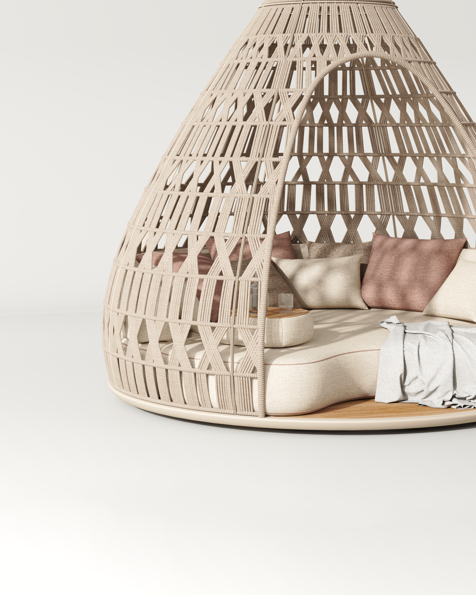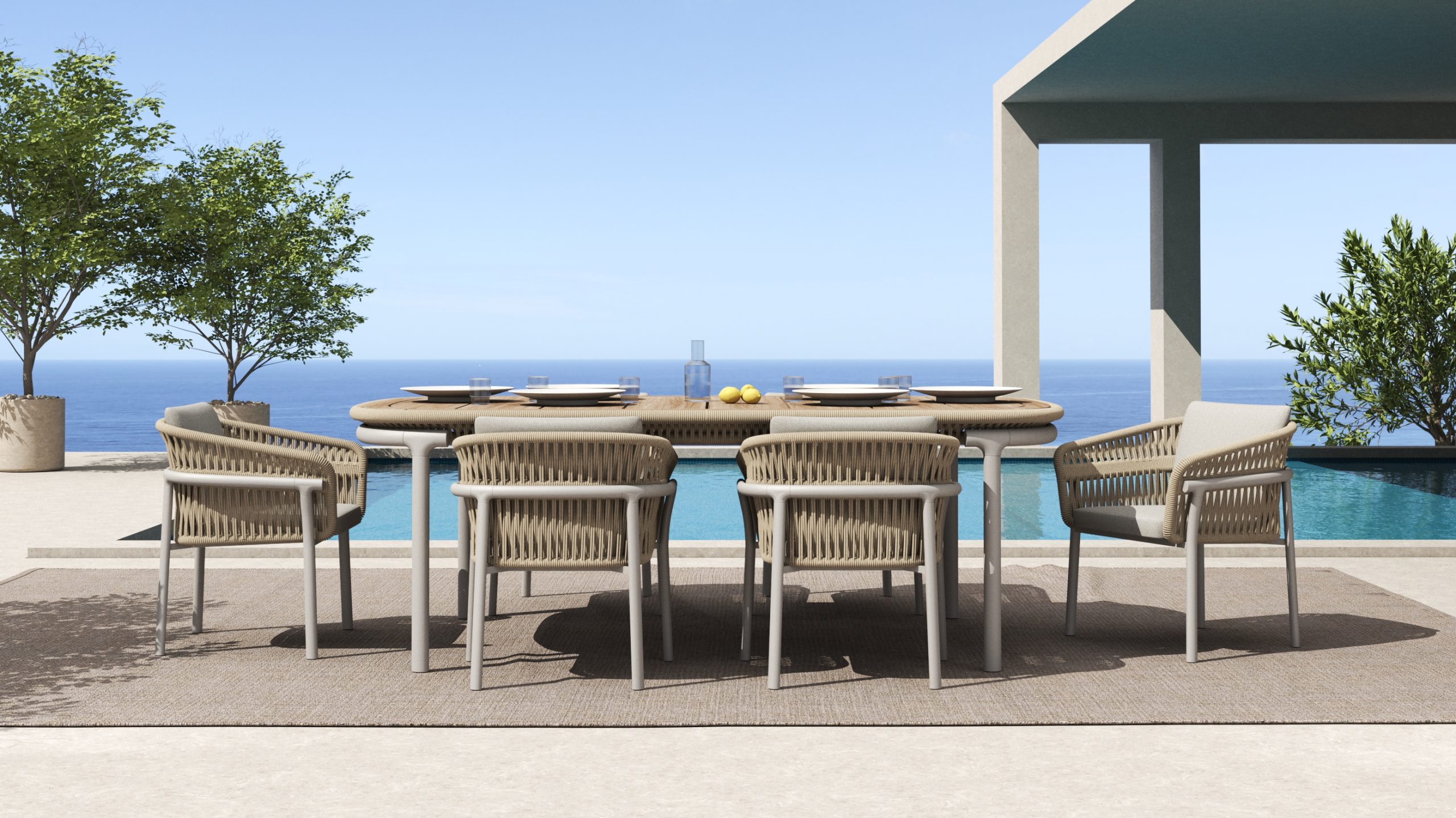 CALYPSO expands the outdoor living experience through a collection that combines lounge and dining settings. A continuous curved shell, defined by rhythmic vertical rope weaving, gently wraps the seating to create a light yet protective structure. The design expresses a refined sense of comfort, craftsmanship, and visual lightness.