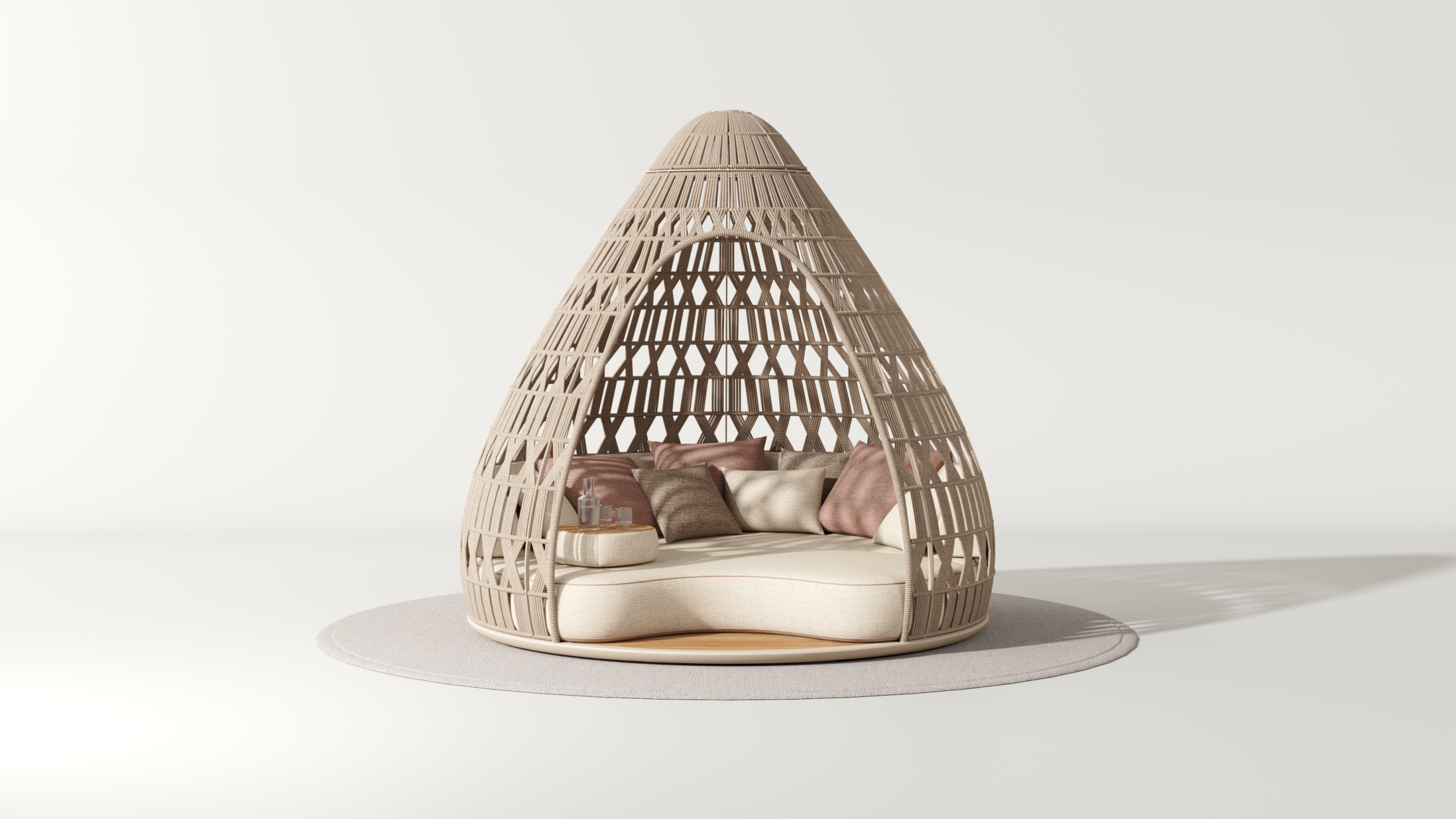 ALICUDI is a contemporary outdoor sanctuary that explores the relationship between architectural geometry and organic comfort. Inspired by the essential beauty of the Aeolian Islands, the daybed features a distinctive teardrop silhouette and an intricate woven skin that filters light, creating a private, immersive atmosphere. It stands as a testament to the “design as a bridge” philosophy—connecting human scale with the open horizon.