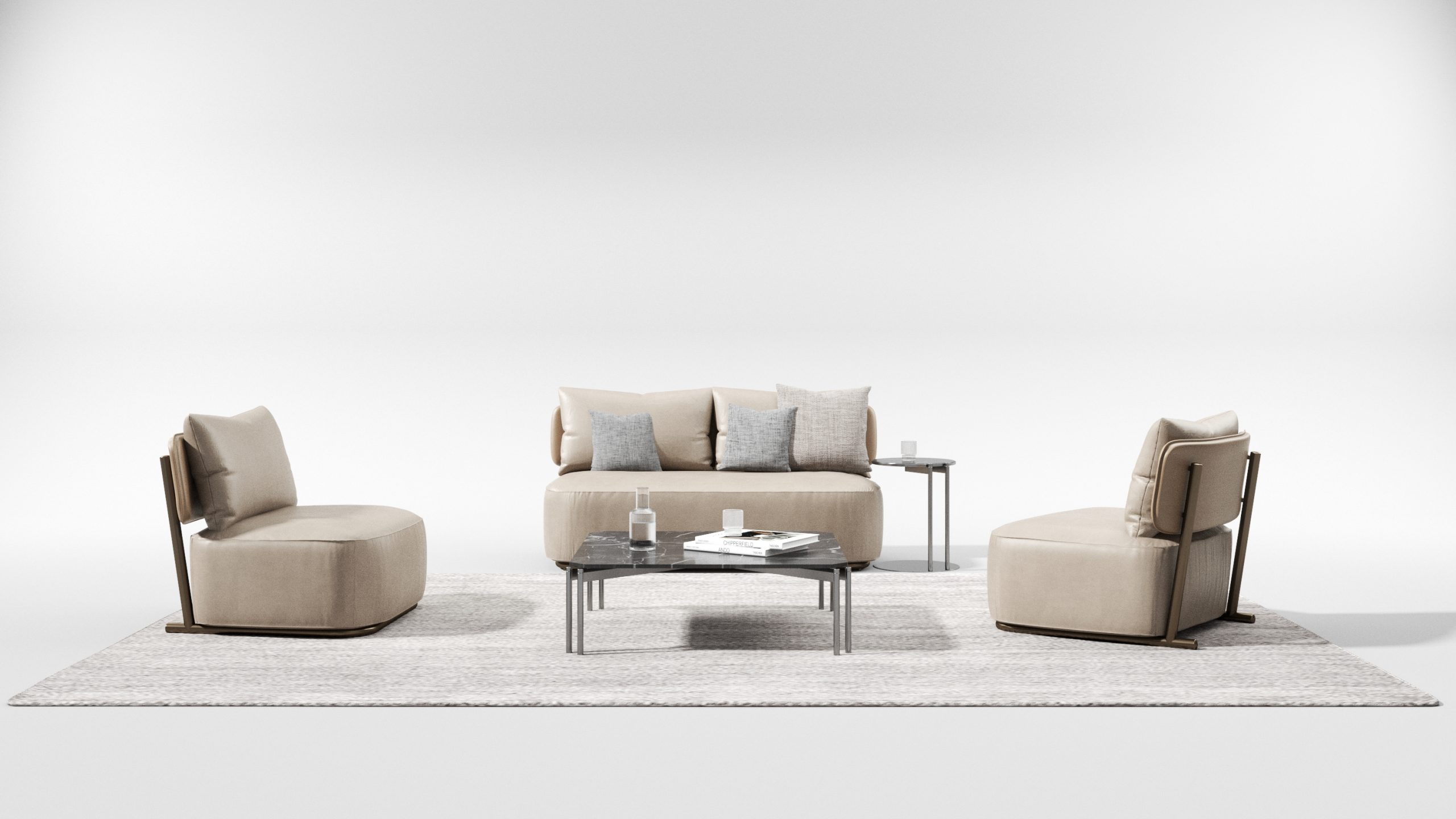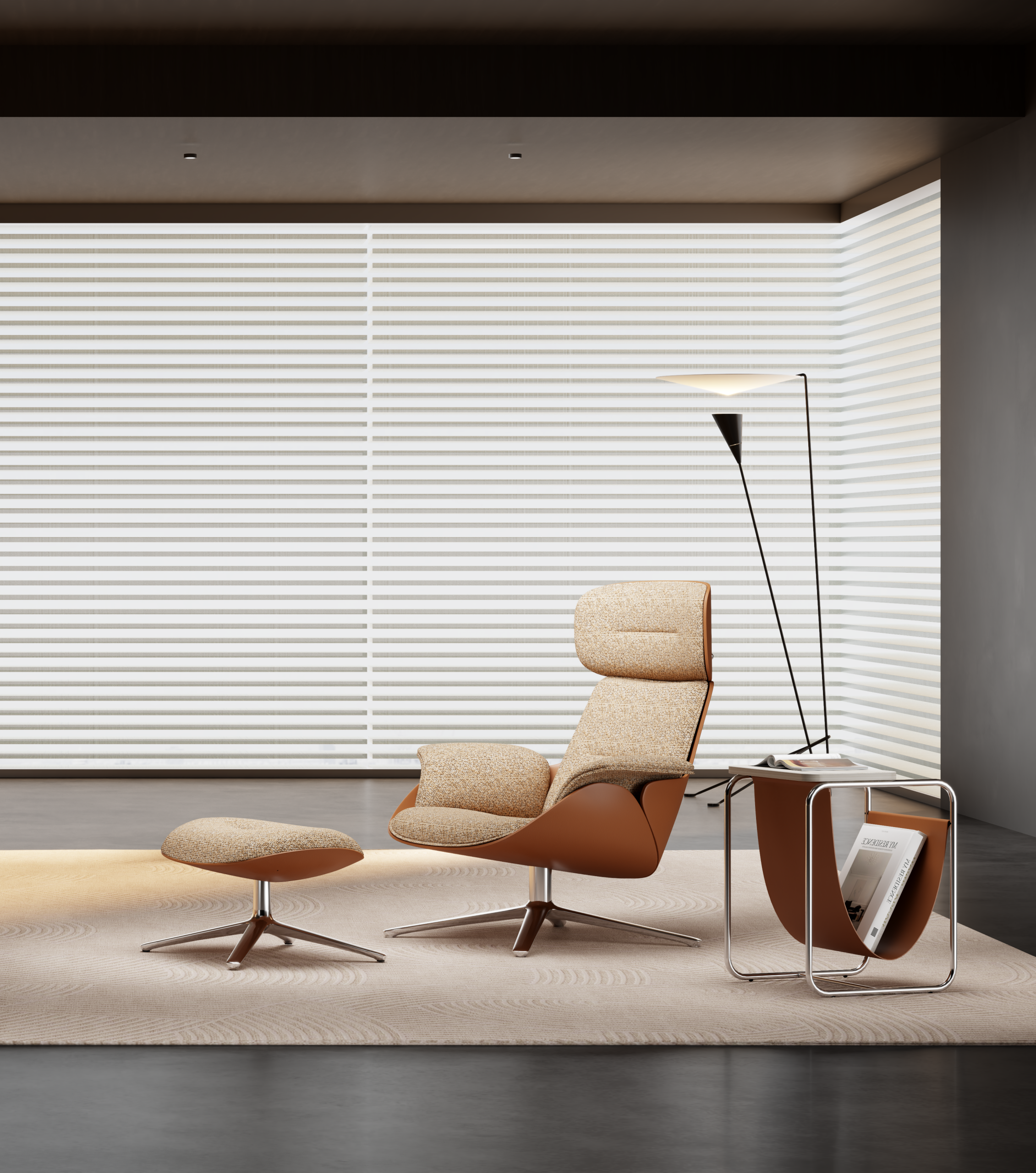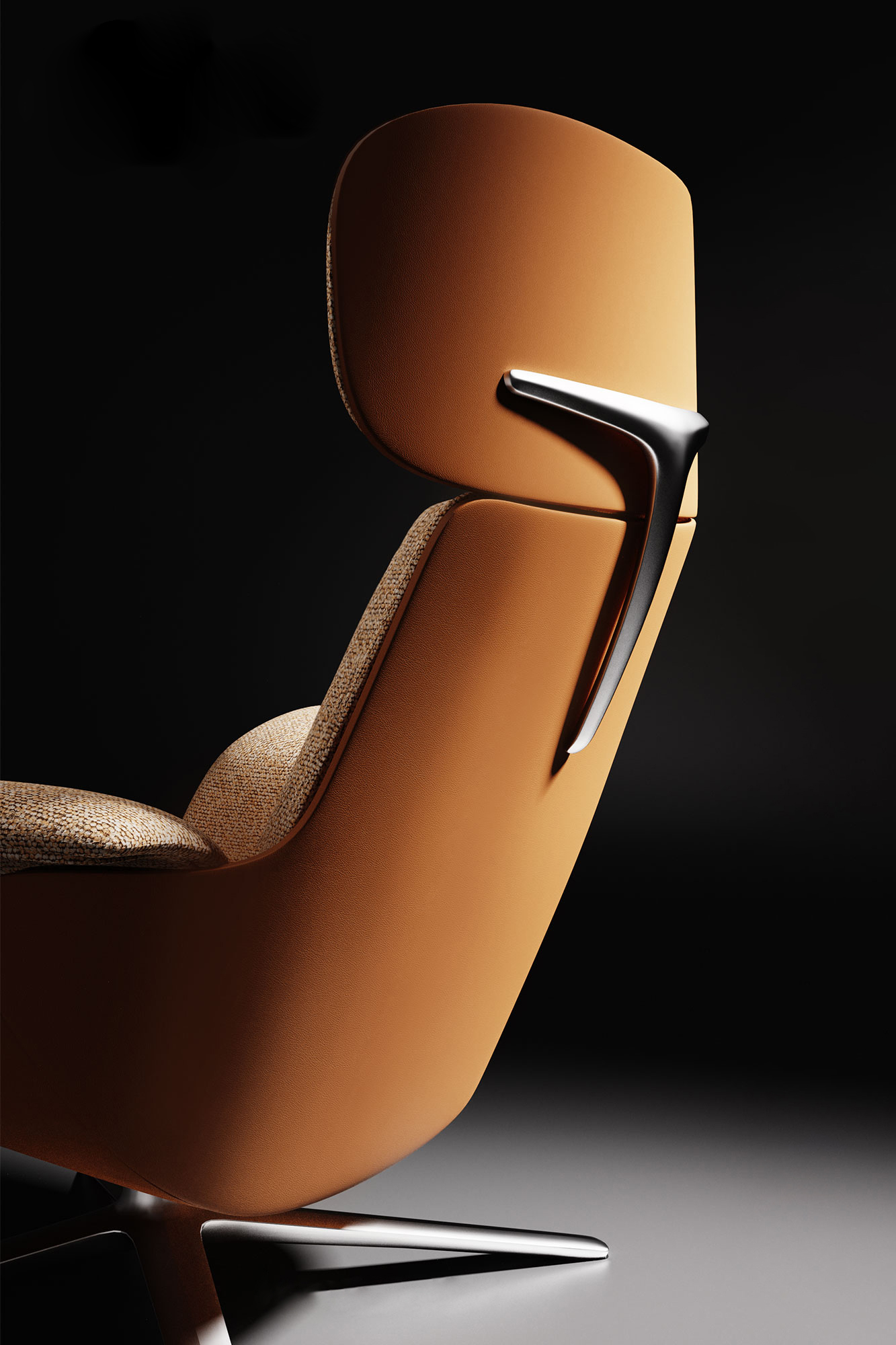 ZOR, designed by CLAUDIO BELLINI Studio for KANO, is a lounge chair defined by a fluid, architectural silhouette and a strong sense of comfort. A continuous outer shell wraps seat, backrest, and headrest in a single dynamic gesture, while soft inner cushions create a welcoming, relaxed experience. The contrast between the sculptural exterior and the upholstered interior defines its refined identity, enhanced by generous proportions, controlled lines, and a swivel base that brings the composition into balance.