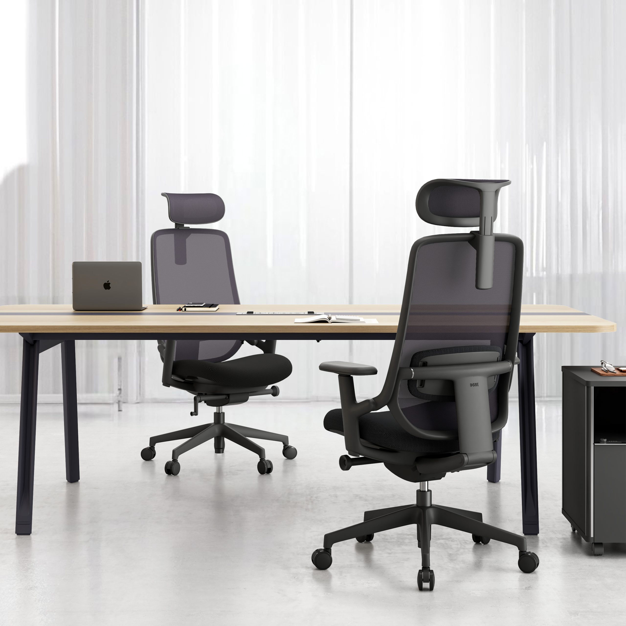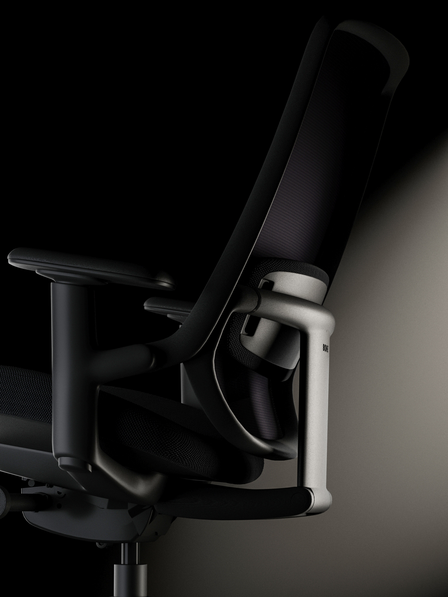 TRIADE is an office chair designed by CLAUDIO BELLINI Studio for B.One. Its distinctive T-shaped structure is seamlessly integrated into the backrest, supporting both lumbar function and reclining movement. The headrest, defined by a separate tubular frame, introduces a clear dual-layer composition.