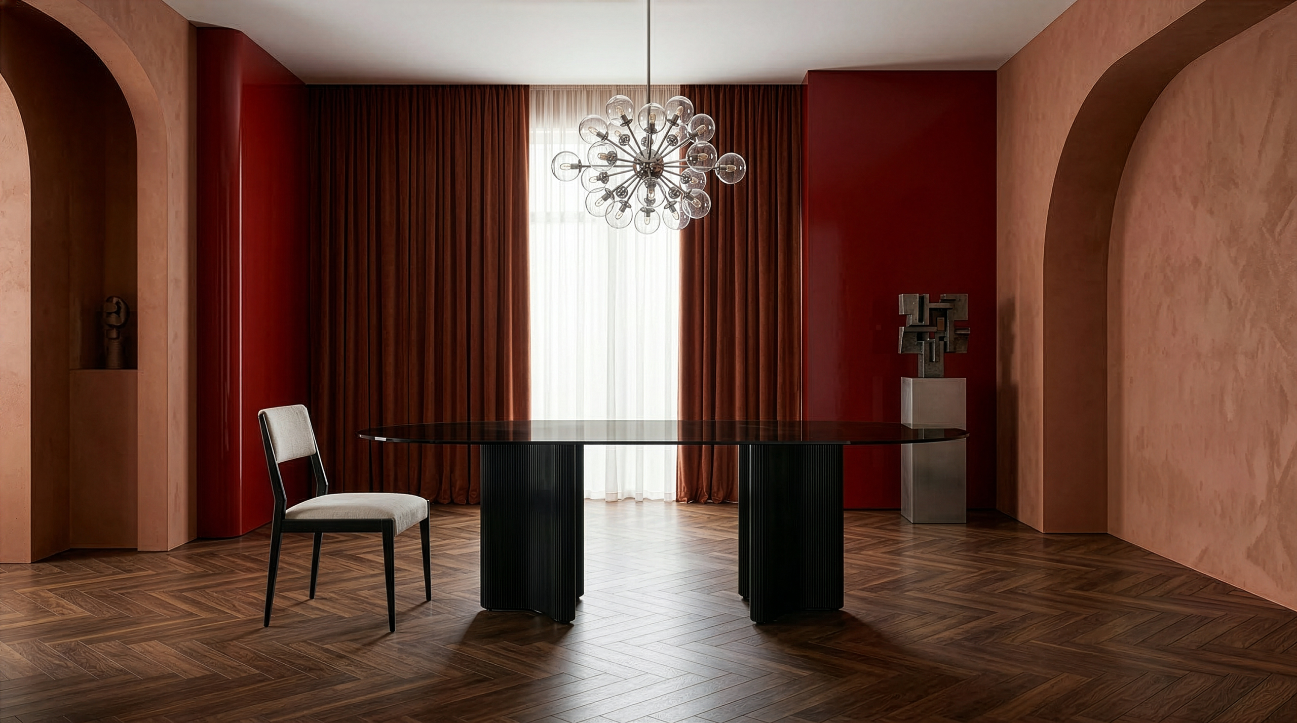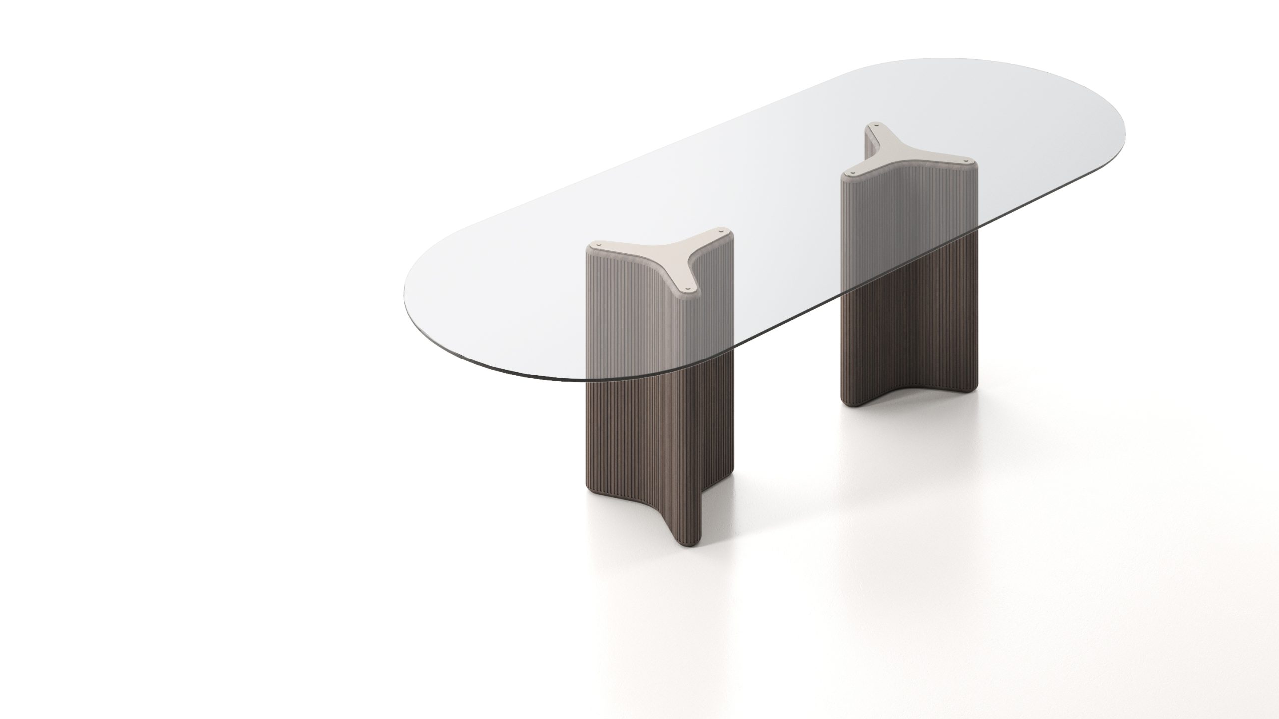 TOBIE is a sculptural, refined design that balances clean geometry with soft, controlled movement. Its base—formed by two offset curved elements with rounded edges—creates a composition that is both architectural and fluid, inspired by the smoothness of river stones. The lacquered top with a protective glass surface enhances depth, shine, and durability, combining aesthetic precision with everyday functionality. A soft-silver base adds a subtle touch of light and sophistication.