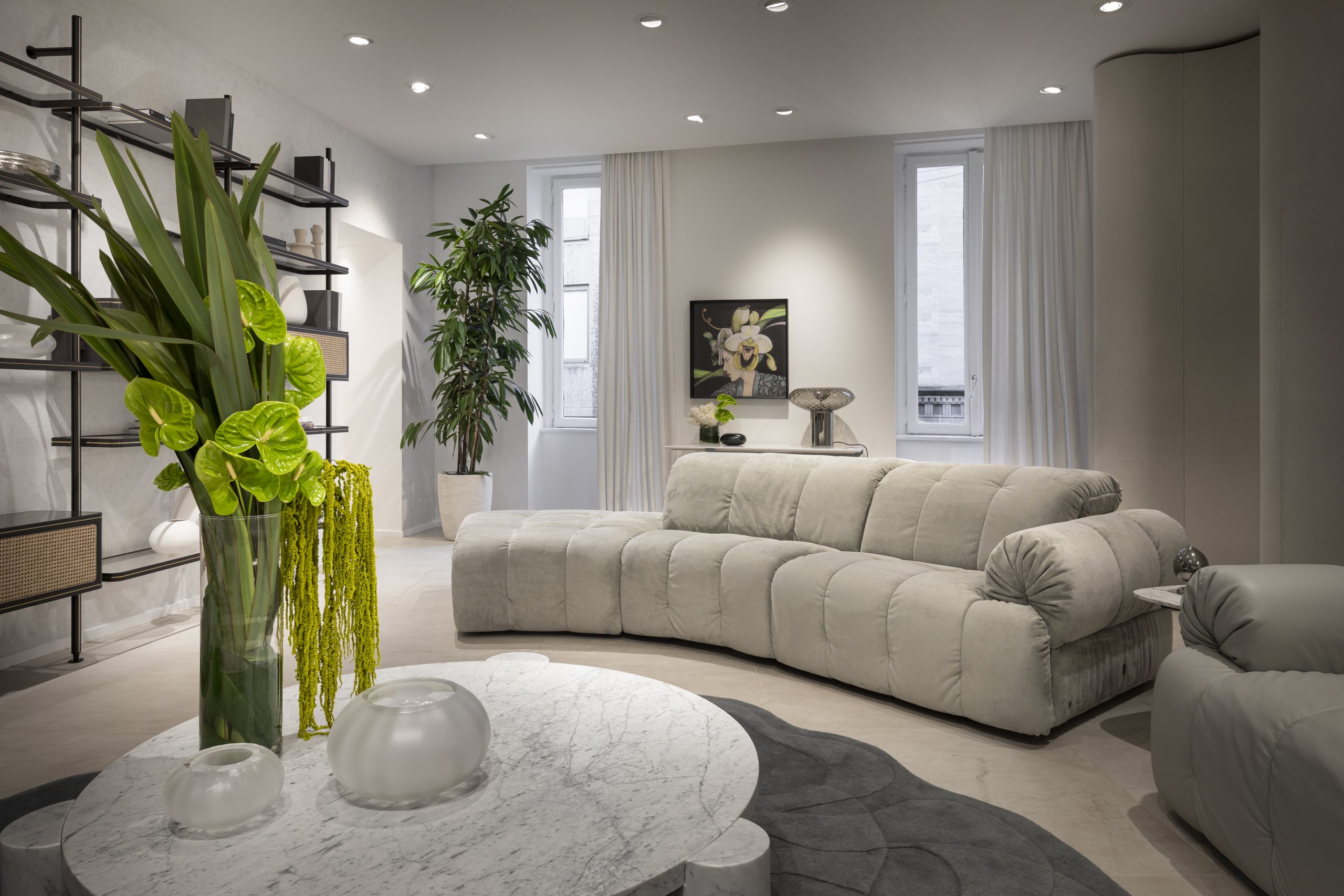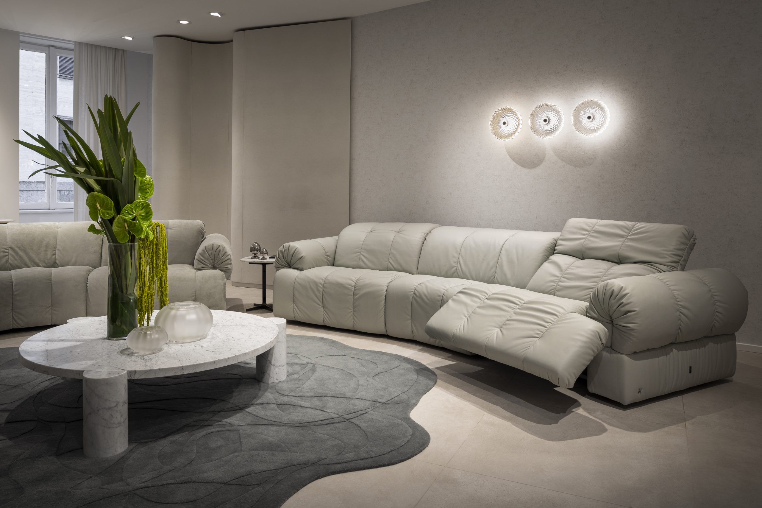 SASSO balances European styling with American comfort, combining refined aesthetics with a generous, welcoming character. Defined by soft, pebble-like volumes and controlled curves, it expresses an organic yet precise design language. The collection is based on a flexible modular system, with linear and curved elements that allow fluid configurations adapting to different spaces. Generous proportions and a relaxed seating experience emphasize comfort, while a palette ranging from neutral tones to more expressive colors reinforces its versatility.